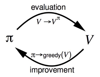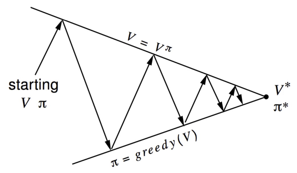 처음에는 멍청한 value function $v$와 멍청한 policy $\pi$가 있을 것이다. 여기서 이제 $v$를 평가하고, (즉 value function을 구하고) 그에 따라 greedy하게 움직이는 $\pi$를 찾고, 그 $\pi$에 대해서 또 평가하고 ($\pi$가 바뀌었으므로 vf도 바뀔 것이기 때문), 또 greedy하게 움직이는 policy를 만들고, $\cdots$ 이 과정을 반복한다. 그러면 결과적으로 $v$가 $v*$에 도달할 것이다. 그 말은 즉 optimal value라는 것을 뜻한다.