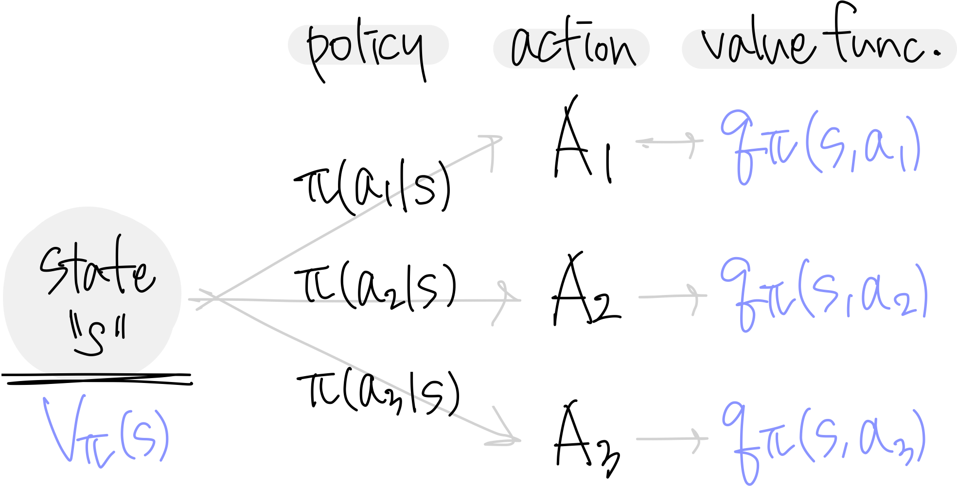 $$ V_{\pi}(s)=\sum_{a\in A}\pi(a|s)\cdot q_{\pi}(s,a) $$