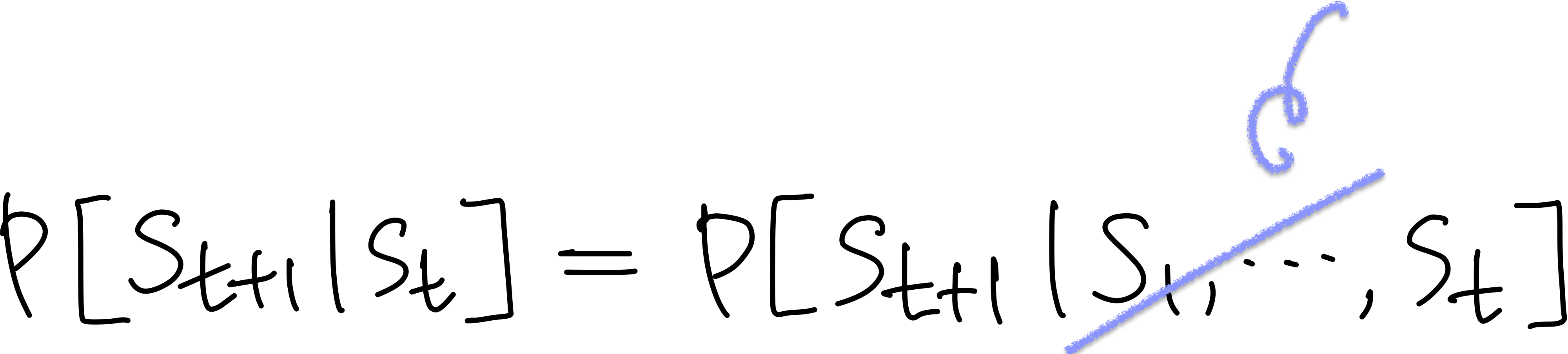 Markov property를 가지는 것은 이전에 어떤 state를 거쳐왔든 다음 state로 갈 확률은 항상 같다는 것을 보장하며, "현재 상태가 주어졌을 때 미래와 과거는 독립적이다"는 가정을 의미하기도 한다. (이러한 무기억성의 성질에 따라 Memoryless Property로도 불린다) i.e. The state is a sufficient statistic of the future... Once the state is known, the history may be thrown away...Ꮚ