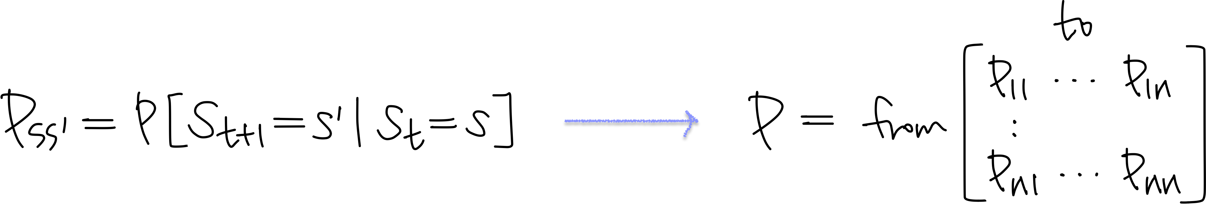 Markov한 state $s$에서 다음 state $s'$로 이동할 확률을 나타낼 수식은 위와 같다. (상태전이확률)