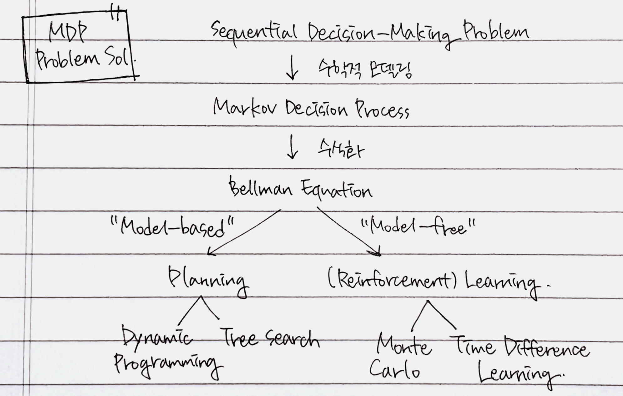 강화학습은 순차적으로 행동을 결정해야 하는 문제를 푸는 것이다. 그러한 문제를 클래식한 수식으로 나타낸 것(형식화한 것)이 MDP이기 때문에 강화학습을 MDP의 문제를 푸는 것이라고 표현하게 된다. 전이 확률에 따라 상태변화가 자동으로 이루어졌던 MP, MRP와는 달리 의사결정이 핵심이 되는 MDP에서는 에이전트가 하는 행동에 의해 상태가 변한다. 따라서 MP에 Action(의 집합)이라는 요소가 더해진 튜플로 표현되고, 추가로 policy라는 개념이 포함된다.