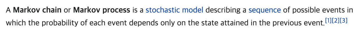 그렇기에 확률론에서 Markov Proecess는 메모리를 갖지 않는, 이산 시간 확률 과정이라고 정의하며, 상태들의 집합 $S$와 전이 확률 행렬 $P$의 두 가지 요소를 가지는 튜플로 표현한다.
