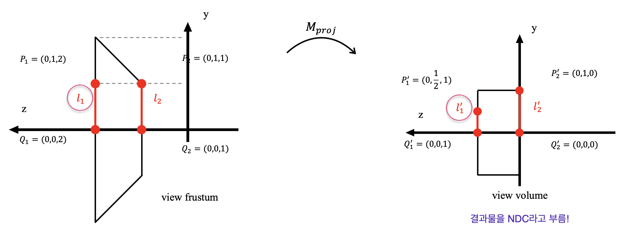 아핀 변환과는 달리 $M_{proj}$의 마지막 열은 $(0\,0\,0\,1)^T$가 아니라 $(0\,0\,1\,0)^T$ 요거다!