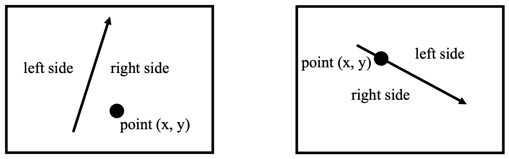 다음과 같이 2D plane을 두 파트로 나누는 line이 있다고 가정해보자. 여기서 Edge equation은 주어진 point가 주어진 line을 기준으로 오른쪽에 있는지, 왼쪽에 있는지를 리턴해주는 함수이다. 리턴값은 left side인 경우 negative number, right는 positive, on line이라면 0이다.