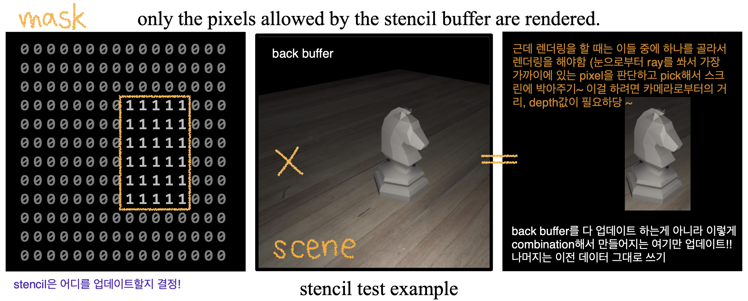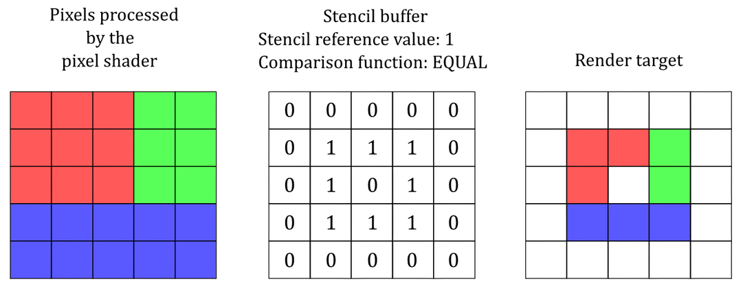 depth-stencil buffer(texture resource)는 depth data와 stencil data를 모두 포함할 수 있다. depth data는 카메라에 가장 가까이 있는 픽셀을 결정하는 데에 사용되고, stencil data는 어떤 픽셀들이 업데이트 될 수 있는지 마스킹하는 데에 사용된다. 두 value data들은 output-merger 단계에서 픽셀을 그릴지 여부를 결정하는 데에 사용된다.