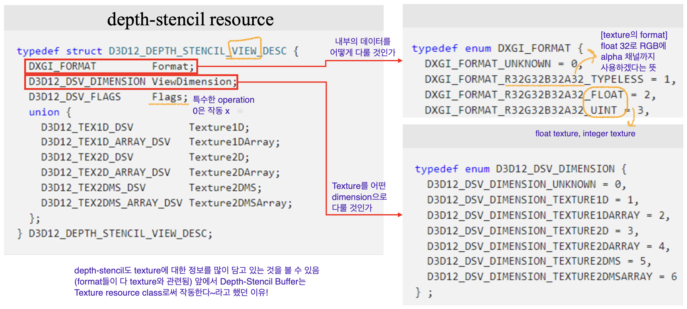 Dx12에서 depth-stencil 리소스의 생성은 texture resource를 이용함.