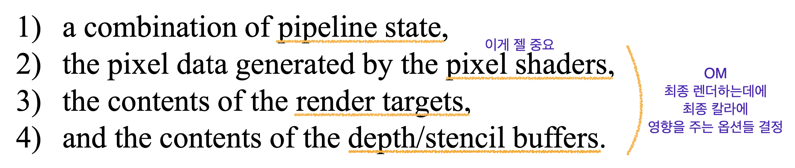 Output-Merger, 줄여서 OM stage에서는 이렇게 스크린 위에 올려줄 final rendered pixel color를 결정한다.