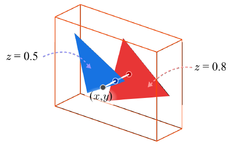 다음 예시를 통해 이해해보자. min_depth(min_z)가 0.0, max_depth(max_z)가 1.0, red triangle의 depth는 0.8, blue triangle의 depth는 0.5라고 가정한다.