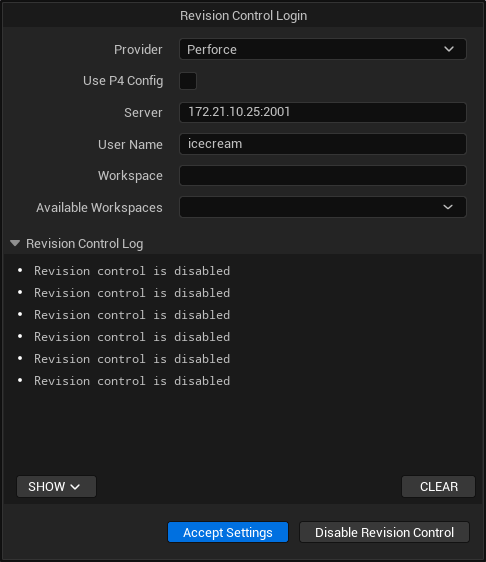 B) .p4config 자동 방식: .p4config 파일 안에 P4PORT, P4USER, P4CLIENT 이런거 설정해서 언리얼/ CLI/ P4V가 자동으로 동일 설정을 사용하도록. 일단 난 저 파일을 세팅 안했던터라 껐음
