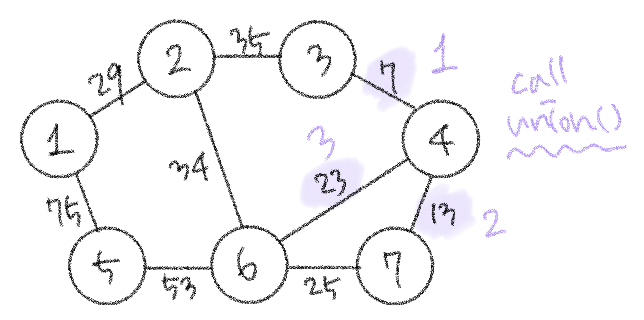 이 알고리즘은 그래프에 포함되어 있는 간선의 개수가 E개일 때, 모든 간선을 하나씩 확인하며 매 간선에 대해 union 및 find 함수를 호출하는 방식으로 동작한다. a, b 노드를 연결하는 간선이 있을 때 a의 루트 노드랑 b의 루트 노드가 같으면 사이클이 발생할 것이다.