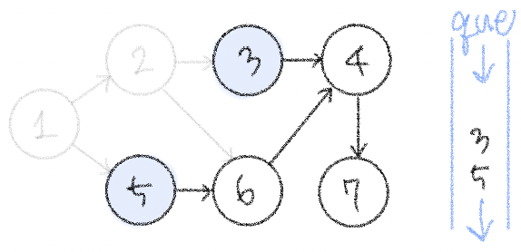 하고 나면 진입차수가 0이 되는 노드 3이 큐에 들어간다.