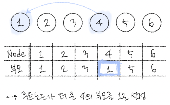 → 보통 구현에서는 번호가 더 작은 원소가 부모 노드가 되도록 한다.