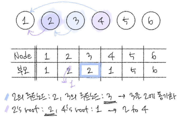 # union 2,4를 수행하는 단계를 보면, "2 4"가 입력될 시점의 2의 루트노드는 2이고 4의 루트노드는 1이다.